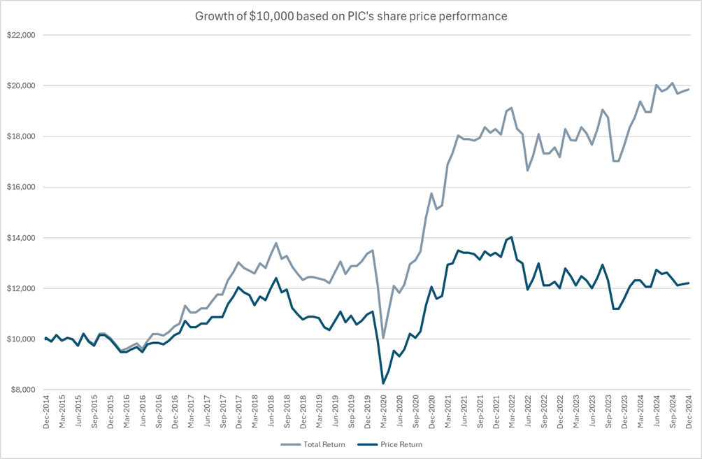 The chart below shows the performance of $10,000 invested in PIC. Total return is the performance of PIC’s share price assuming the reinvestment of dividends on ex-date. An investor that fully participated in the DRP between 2015 and 31 December 2024 would have a return of 76.5% or their $10,000 investment would be worth $19,862.
